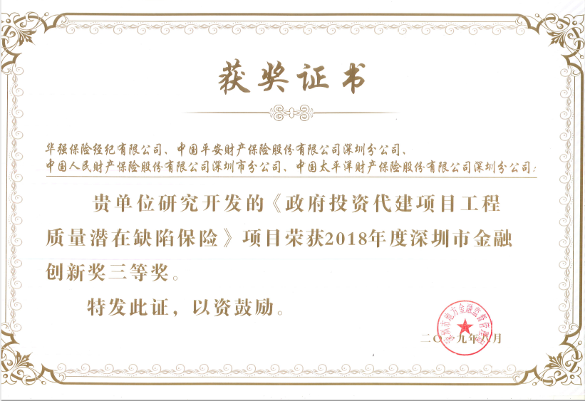 2019年7月20日,由华强保险经纪负责牵头,联合三大保险公司共同申报的“政府投资代建项目工程质量潜在缺陷保险”(IDI)创新项目在2018年度深圳市金融创新奖的评选活动中成功入围,荣获金融创新奖三等奖。此次获奖是深圳市政府对华强保险经纪在保险领域开拓实践和持续创新所取得成绩的充分肯定与支持。